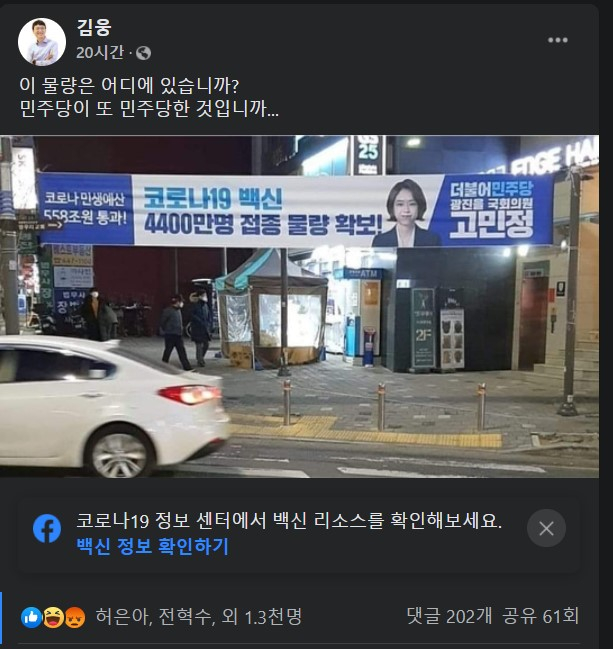 김웅 고민정 현수막 공유하며 백신 4400만명분 어딨나 중앙일보